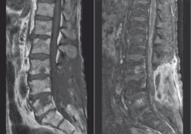 69 yaşında erkek hasta acil servise 2 aydır ilerleyici şekilde devam eden bilateral alt ekstremite güç kaybı, sol fasiyal güçsüzlük, diplopi, son 6 ayda 20,4 kg kayıp ve yeni başlangıçlı üriner inkontinans yakınmaları ile başvuruyor. Yakınmalarından 2 ay önce semptomatik spinal stenoz nedeniyle 3 lumbar ve 1 sakral vertebrayı içerecek şekilde laminektomi operasyonu geçirmiş. Ancak, cerrahiden fayda görmediğini, bacaklarındaki kuvvetsizliğin arttığını belirtiyor. Baş ağrısı, ateş, öksürük, immünosüpresif ilaç kullanımı, yurtdışı seyahat öyküsü tariflemiyor. Özgeçmişinde, hipertansiyon ve 50 paket/yıl sigara içme öyküsü var. Vital bulguları stabil olan hastanın nörolojik muayenesinde bilinci açık, solda görme keskinliği 20/400, solda afferent pupil defekti, solda fasiyal paralizi saptanıyor. Tüm ekstremitelerinde kas kütlesinde azalma ve hipotoni dikkati çekiyor. Üst torakal bölgede ve bilateral alt ekstremitelerde fasikülasyon gözleniyor. Alt ekstremitelerde kas gücü 2/5 saptanıyor, DTR alınamıyor. Duyu muayenesinde anormallik saptanmıyor. Laboratuvar tetkiklerinde tam kan sayımı, PAAC grafisi ve akciğer tomografisi normal saptanıyor. Kontrastlı kranial ve spinal MRG’de serebral konveksitelerde, serebellumda, kauda ekuina dahil spinal kord leptomeninkslerinde kontrast tutulumu gözleniyor (Şekil). BOS incelemesinde hemen tamamı lenfosit hakiminde olmak üzere beyaz küre 29/mm3, protein 142 mg/dL, glukoz 19 mg/dL saptanıyor. BOS sitolojisi normal saptanan hastanın, tüberküloz ve mantar enfeksiyon incelemeleri de negatif bulunuyor. Tekrarlanan akım sitometride anormal B ve T hücre popülasyonu gözlenmiyor. Serum ACE’si normal saptanıyor. Tüm vücut PET incelemesine yoğun leptomemingeal ve sinir kökü hipermetabolizması saptansa da, primer malignansiye ait kanıt bulunamıyor. Bu hastanın en olası tanısı nedir?